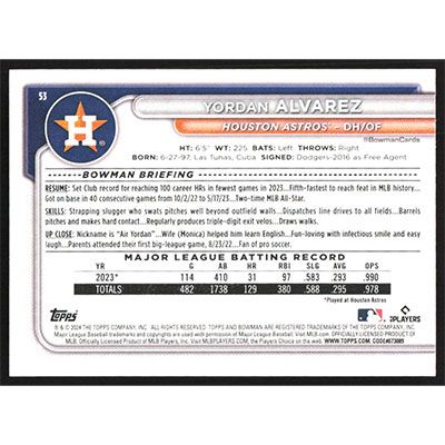 This is a 2024 Bowman Yordan Alvarez baseball card. The card is #53 and pictures show condition.