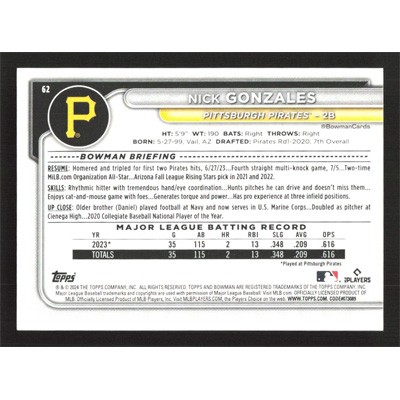 This is a 2024 Bowman Nick Gonzales baseball card. The card is #62 and pictures show condition.