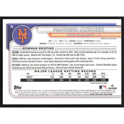 This is a 2024 Bowman Francisco Alvarez baseball card. The card is #75 and pictures show condition.