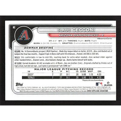 This is a 2024 Bowman Slade Cecconi baseball card. The card is #82 and pictures show condition.