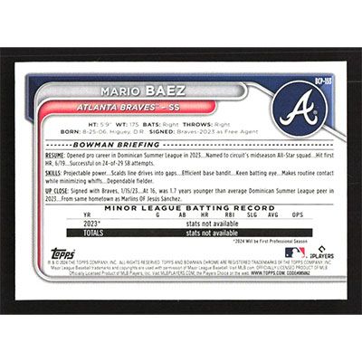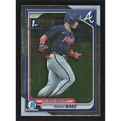 This is a 2024 Bowman Chrome Prospects Mario Baez baseball card. The card is #BCP-153 and pictures show condition.