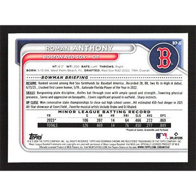 This is a 2024 Bowman Chrome Prospects Roman Anthony baseball card. The card is #BCP-22 and pictures show condition.