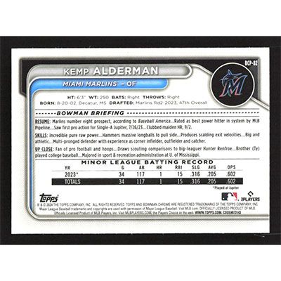 This is a 2024 Bowman Chrome Prospects Kemp Alderman baseball card. The card is #BCP-82 and pictures show condition.