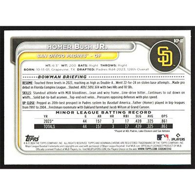 This is a 2024 Bowman Chrome Prospects Homer Bush Jr. baseball card. The card is #BCP-87 and pictures show condition.
