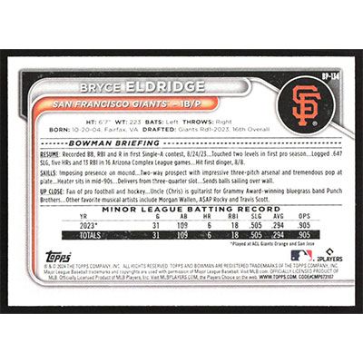This is a 2024 Bowman Prospects Bryce Eldridge baseball card. The card is #BP-134 and pictures show condition.