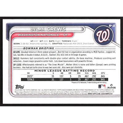 This is a 2024 Bowman Prospects Dylan Crews baseball card. The card is #BP-23 and pictures show condition.