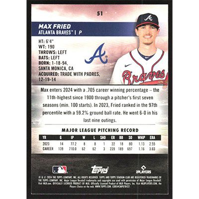 This is a 2024 Stadium Club Max Fried baseball card. The card is #51 and pictures show condition.