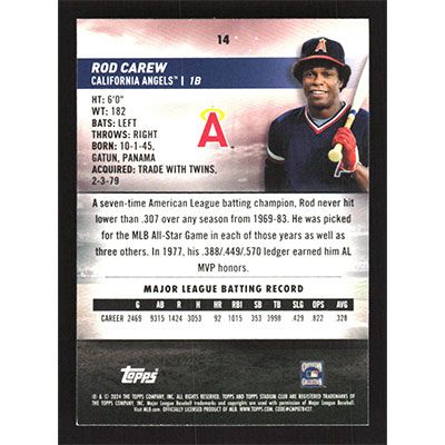 This is a 2024 Stadium Club Red Foil Rod Carew baseball card. The card is #14 and pictures show condition.