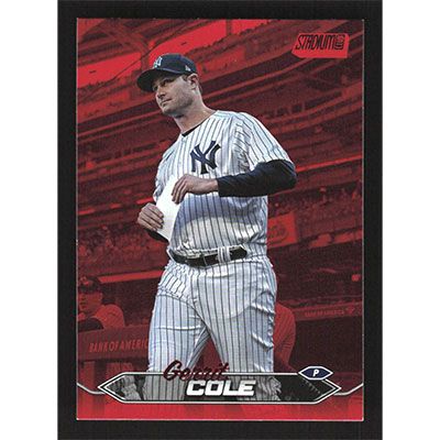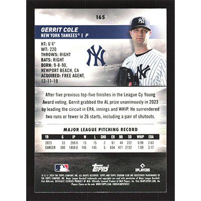 This is a 2024 Stadium Club Red Foil Gerrit Cole baseball card. The card is #165 and pictures show condition.