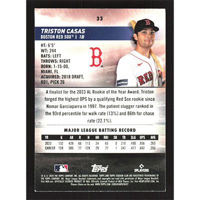 This is a 2024 Stadium Club Red Foil Triston Casas baseball card. The card is #33 and pictures show condition.