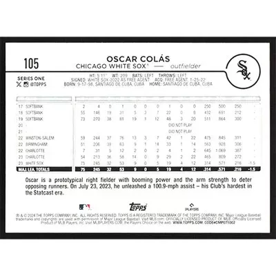 This is a 2024 Topps Oscar Colas baseball card. The card is #105 and pictures show condition.