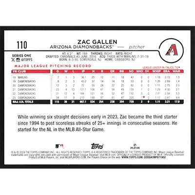 This is a 2024 Topps Zac Gallen baseball card. The card is #110 and pictures show condition.