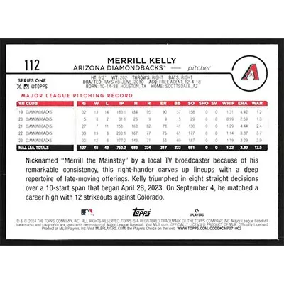 This is a 2024 Topps Merrill Kelly baseball card. The card is #112 and pictures show condition.