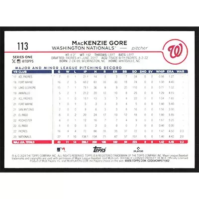 This is a 2024 Topps MacKenzie Gore baseball card. The card is #113 and pictures show condition.