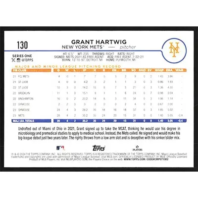 This is a 2024 Topps Grant Hartwig baseball card. The card is #130 and pictures show condition.