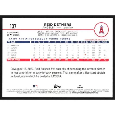 This is a 2024 Topps Reid Detmers baseball card. The card is #137 and pictures show condition.