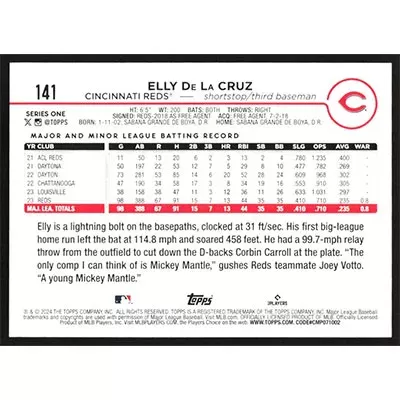 This is a 2024 Topps Elly De La Cruz baseball card. The card is #141 and pictures show condition.