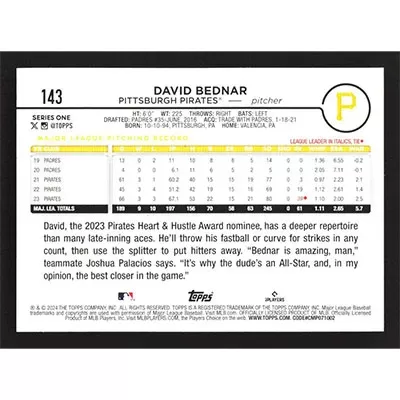 This is a 2024 Topps David Bednar baseball card. The card is #143 and pictures show condition.