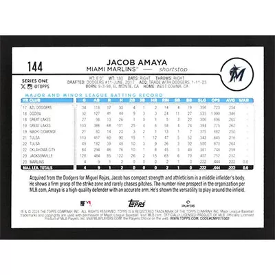 This is a 2024 Topps Jacob Amaya baseball card. The card is #144 and pictures show condition.
