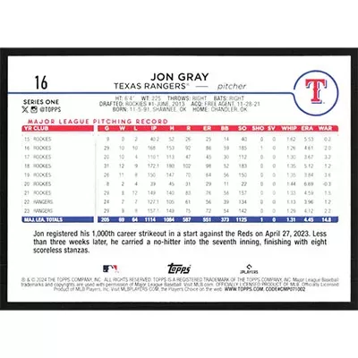 This is a 2024 Topps Jon Gray baseball card. The card is #16 and pictures show condition.