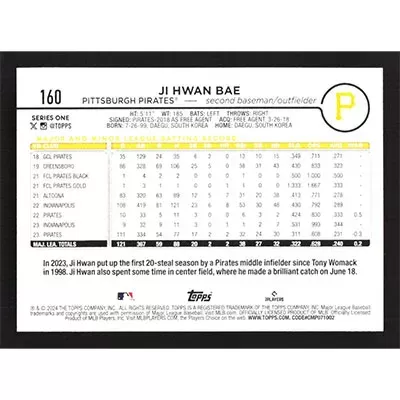 This is a 2024 Topps Ji Hwan Bae baseball card. The card is #160 and pictures show condition.