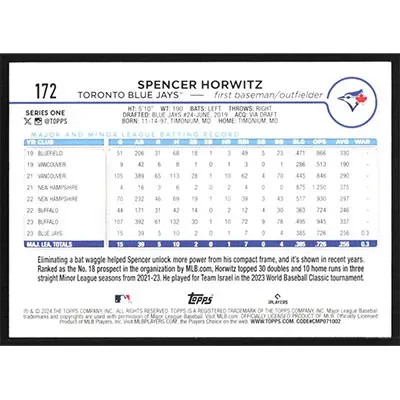 This is a 2024 Topps Spencer Horwitz baseball card. The card is #172 and pictures show condition.