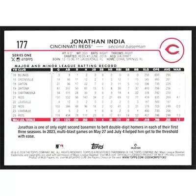 This is a 2024 Topps Jonathan India baseball card. The card is #177 and pictures show condition.