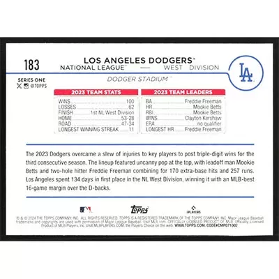 This is a 2024 Topps Los Angeles Dodgers baseball card. The card is #183 and pictures show condition.