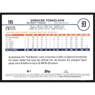 This is a 2024 Topps Spencer Torkelson baseball card. The card is #185 and pictures show condition.