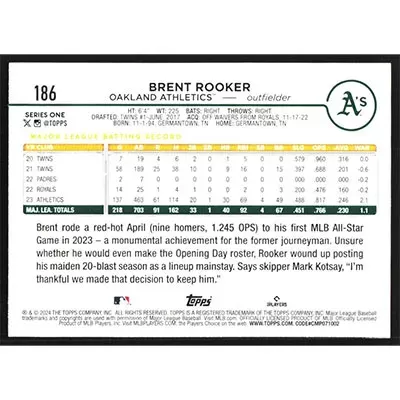 This is a 2024 Topps Brent Rooker baseball card. The card is #186 and pictures show condition.