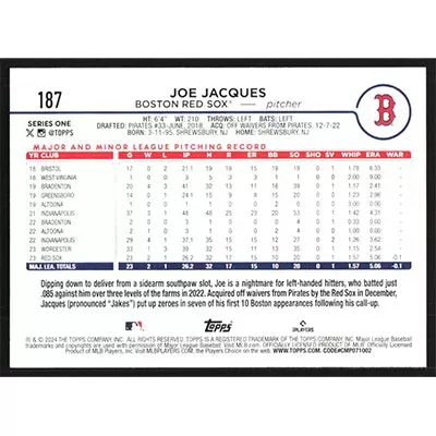 This is a 2024 Topps Joe Jacques baseball card. The card is #187 and pictures show condition.