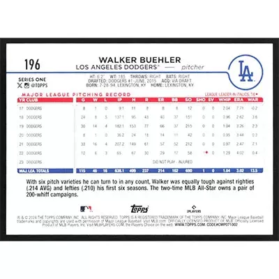 This is a 2024 Topps Walker Buehler baseball card. The card is #196 and pictures show condition.