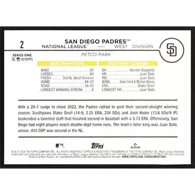 This is a 2024 Topps San Diego Padres baseball card. The card is #2 and pictures show condition.