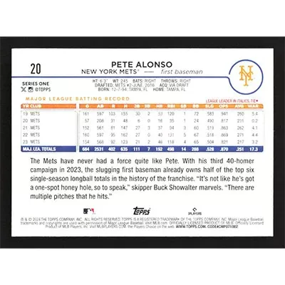 This is a 2024 Topps Pete Alonso baseball card. The card is #20 and pictures show condition.