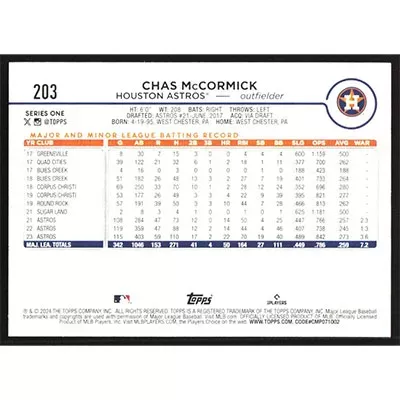 This is a 2024 Topps Chas McCormick baseball card. The card is #203 and pictures show condition.