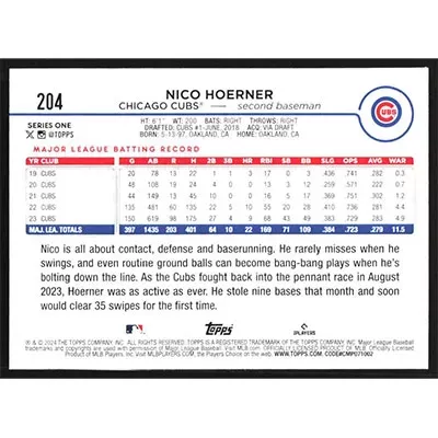 This is a 2024 Topps Nico Hoerner baseball card. The card is #204 and pictures show condition.