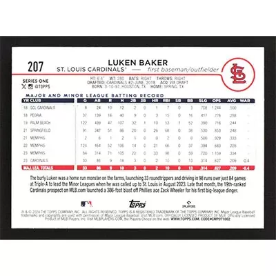 This is a 2024 Topps Luken Baker baseball card. The card is #207 and pictures show condition.