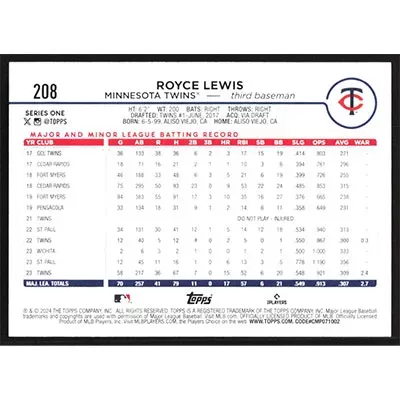 This is a 2024 Topps Royce Lewis baseball card. The card is #208 and pictures show condition.