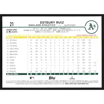 This is a 2024 Topps Esteury Ruiz baseball card. The card is #21 and pictures show condition.