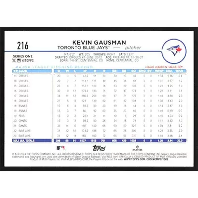 This is a 2024 Topps Kevin Gausman baseball card. The card is #216 and pictures show condition.