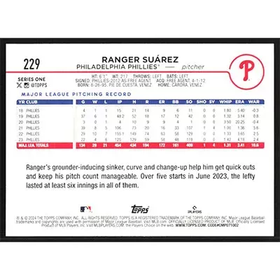 This is a 2024 Topps Ranger Suarez baseball card. The card is #229 and pictures show condition.