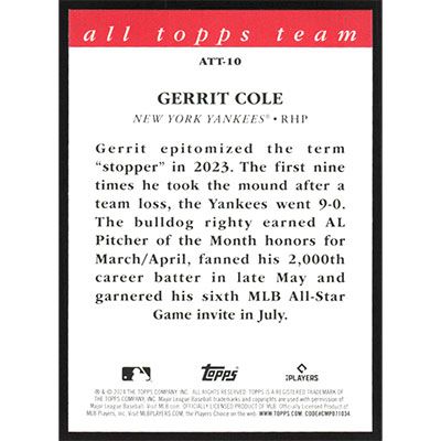 This is a 2024 Topps '23 All-Topps Team Gerrit Cole baseball card. The card is #ATT-10 and pictures show condition.