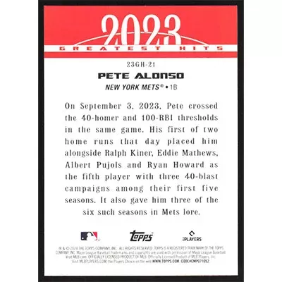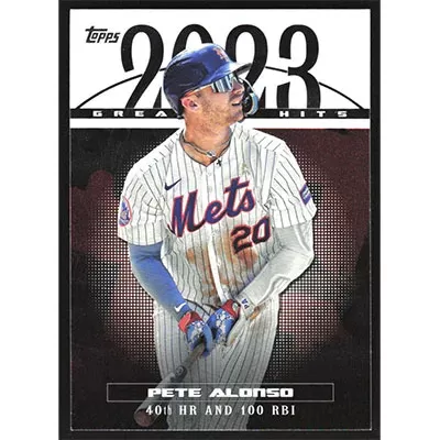 This is a 2024 Topps '23 Greatest Hits Pete Alonso baseball card. The card is #23GH-21 and pictures show condition.