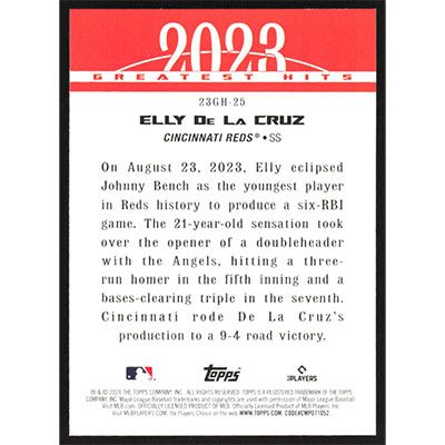 This is a 2024 Topps '23 Greatest Hits Elly De La Cruz baseball card. The card is #23GH-25 and pictures show condition. Team(s): Cincinnati Reds Rookie Card (RC)