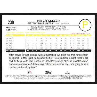 This is a 2024 Topps Mitch Keller baseball card. The card is #230 and pictures show condition.