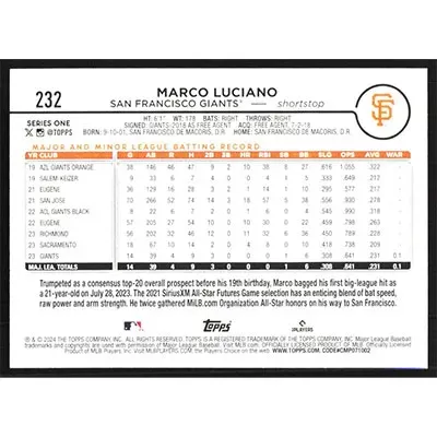 This is a 2024 Topps Marco Luciano baseball card. The card is #232 and pictures show condition.