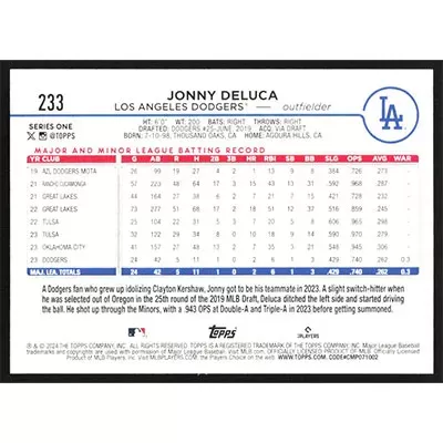 This is a 2024 Topps Jonny Deluca baseball card. The card is #233 and pictures show condition.