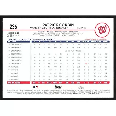 This is a 2024 Topps Patrick Corbin baseball card. The card is #236 and pictures show condition.