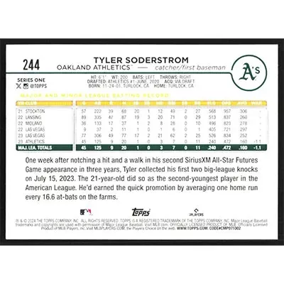 This is a 2024 Topps Tyler Soderstrom baseball card. The card is #244 and pictures show condition.
