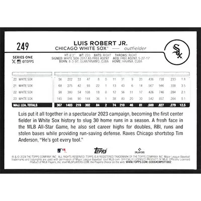 This is a 2024 Topps Luis Robert Jr. baseball card. The card is #249 and pictures show condition.